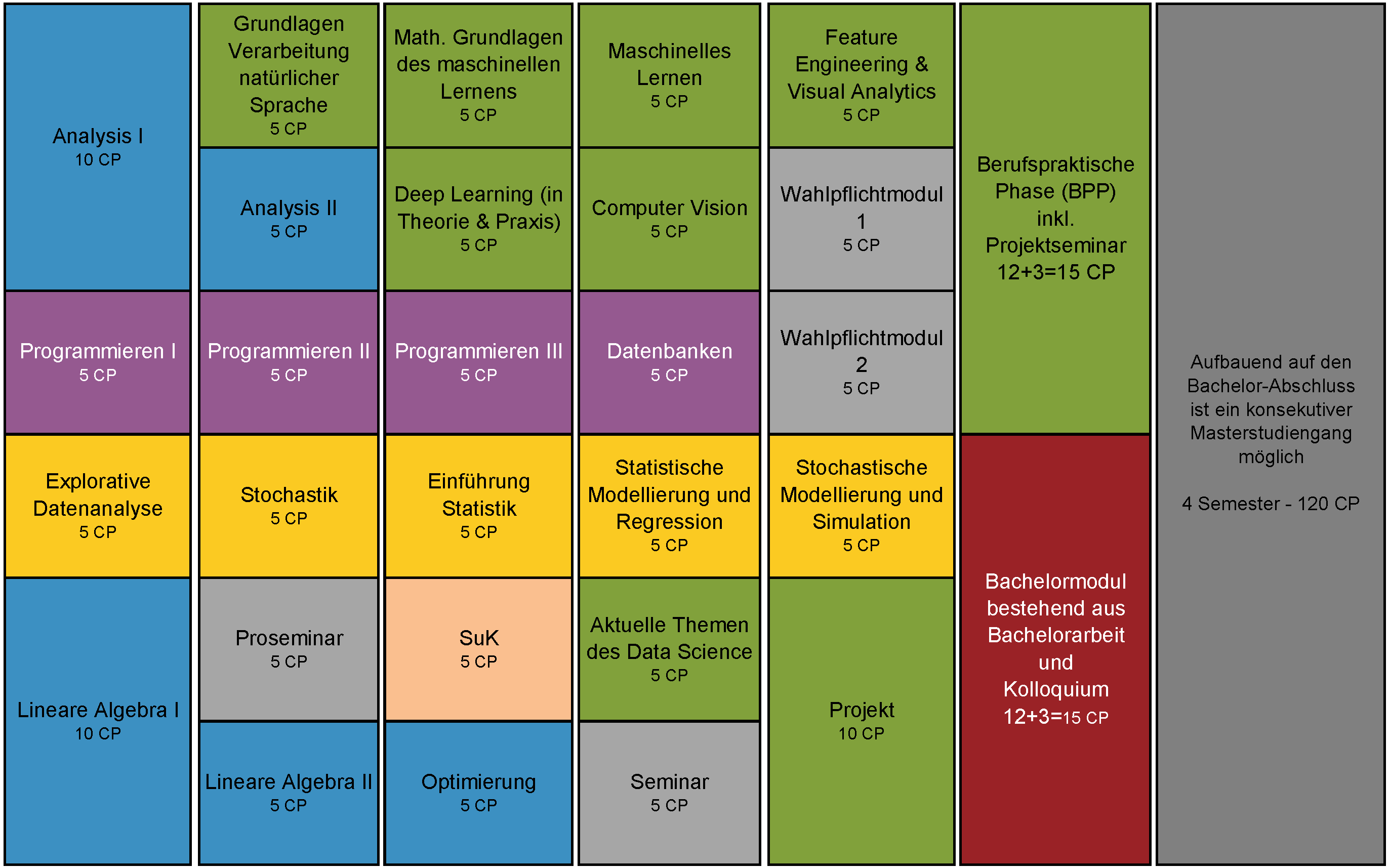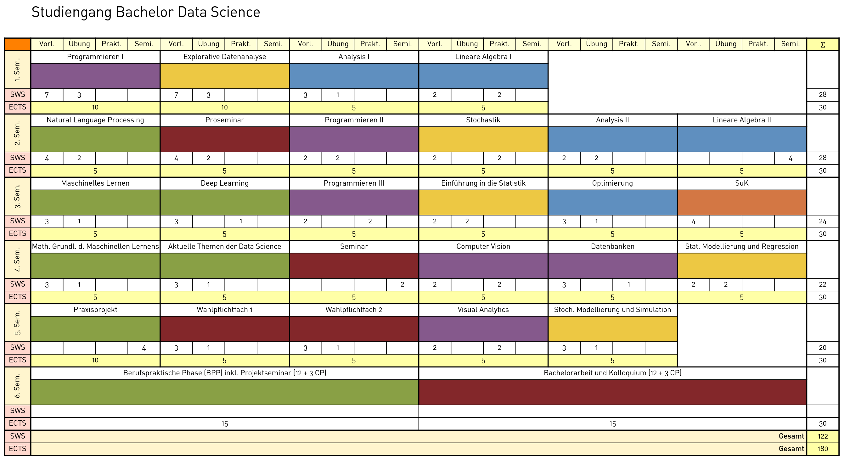 Der Studiengang Data Science kombiniert Informatik, angewandte Mathematik und moderne Datenanalyse und damit die Prinzipien der künstlichen Intelligenz. Damit eröffnest du dir beste Karrierechancen in datenintensiven Berufsfeldern, wie etwa IT, Industrie, Gesundheitswesen oder Marketing, sowie zahlreichen weiteren Branchen. Praxisnahe Inhalte, modernste Technologien und engagierte Lehrende sorgen dafür, dass du von Beginn an optimal auf eine erfolgreiche Laufbahn im Data-Science-Umfeld vorbereitet bist.